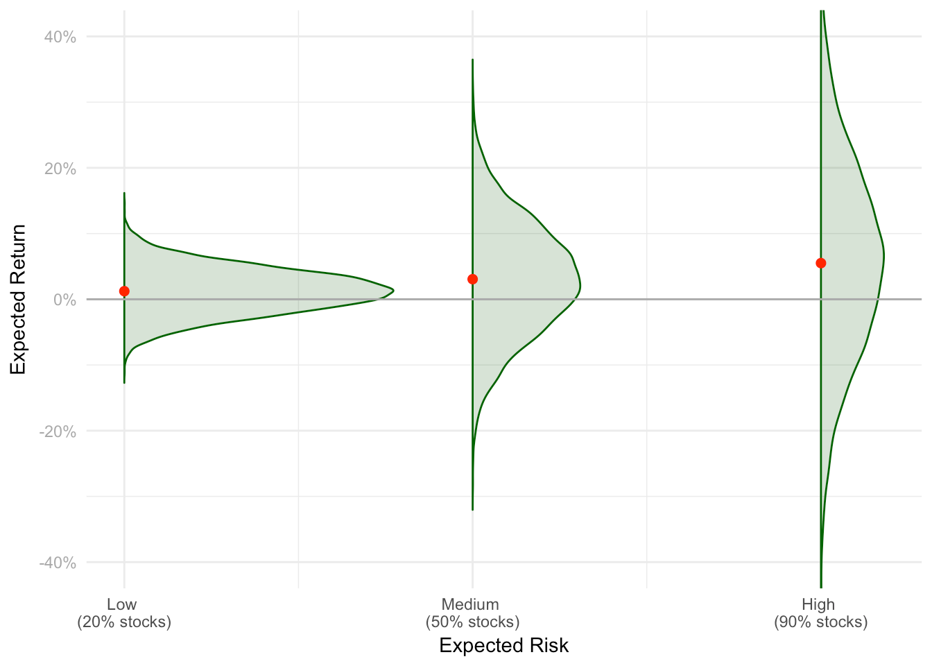 Now, we see that as the thing called “risk” increases (that is, as we move from left to right on the graph by having a portfolio of more stocks, or stocks with higher beta), not only does the expected return increase, but the range of possible outcomes becomes wider and the bad outcomes can also become worse.