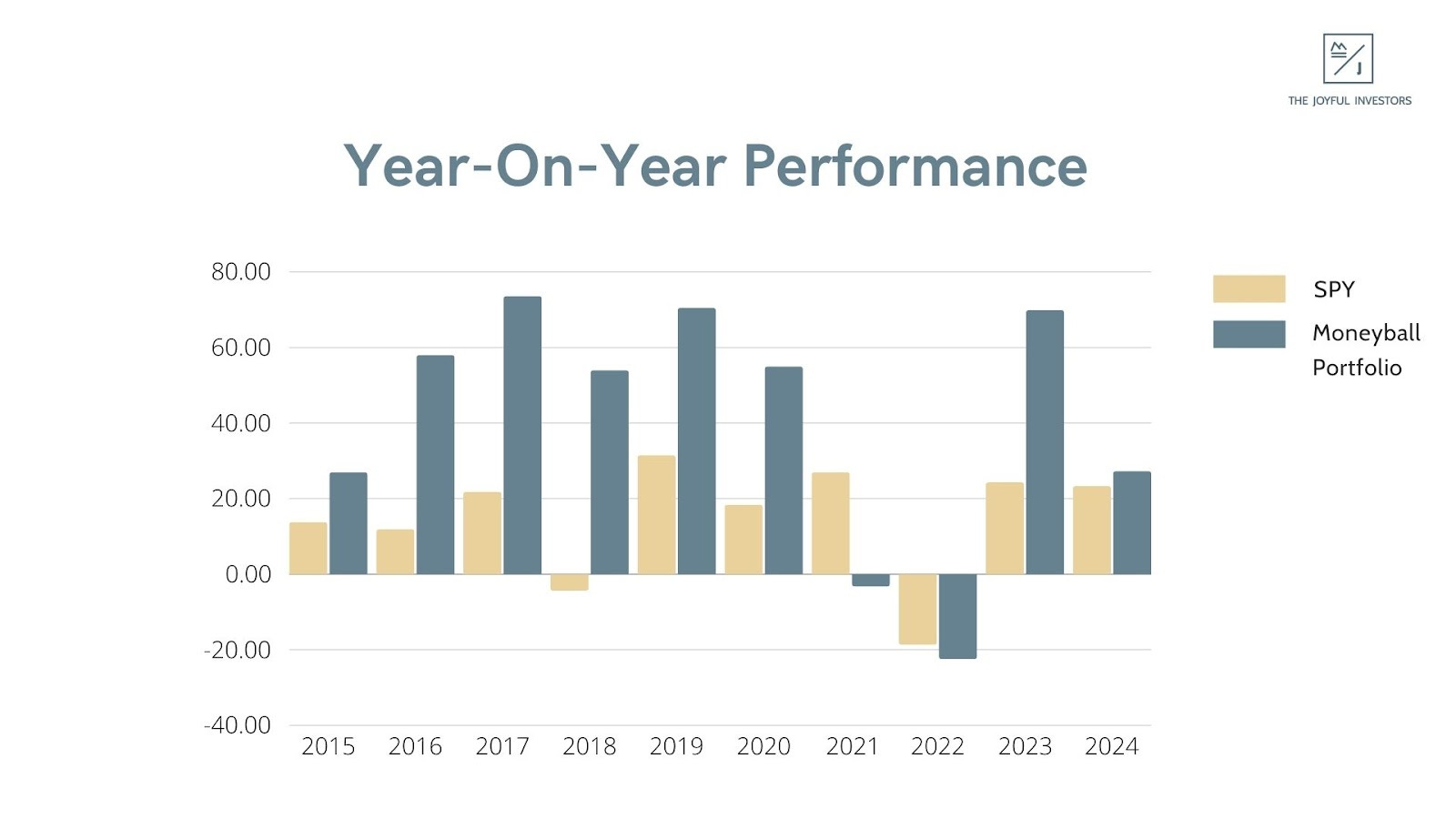 As we wrap up the 2024 performance review, here’s a year-on-year comparison of our Moneyball Investing Portfolio, represented in green, against the S&P 500, shown in yellow. Over the years, our portfolio has generally outperformed, delivering stronger results in most periods.